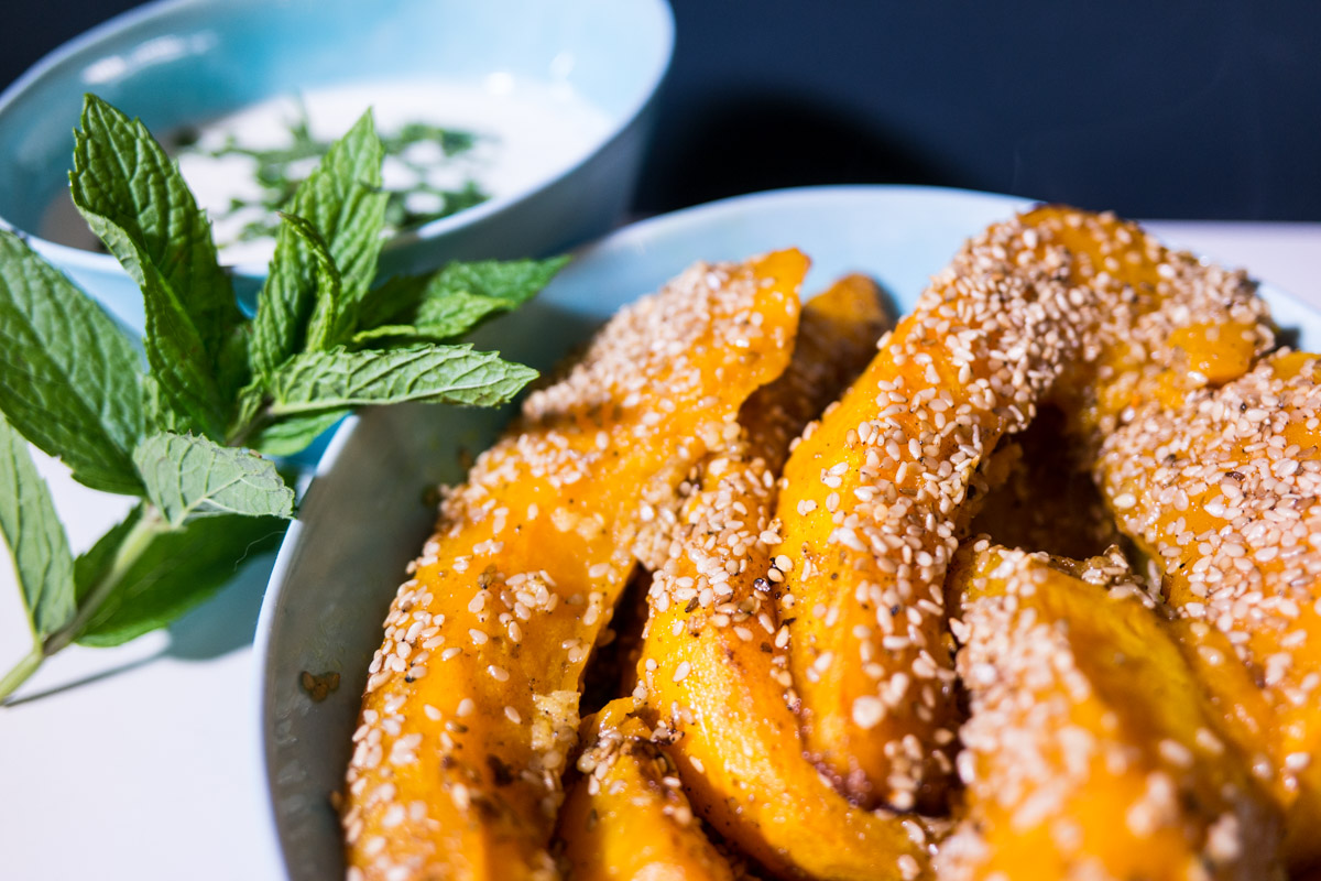 Rezept für orientalischen Hokkaido Kürbis vom Blech mit Minzdipp